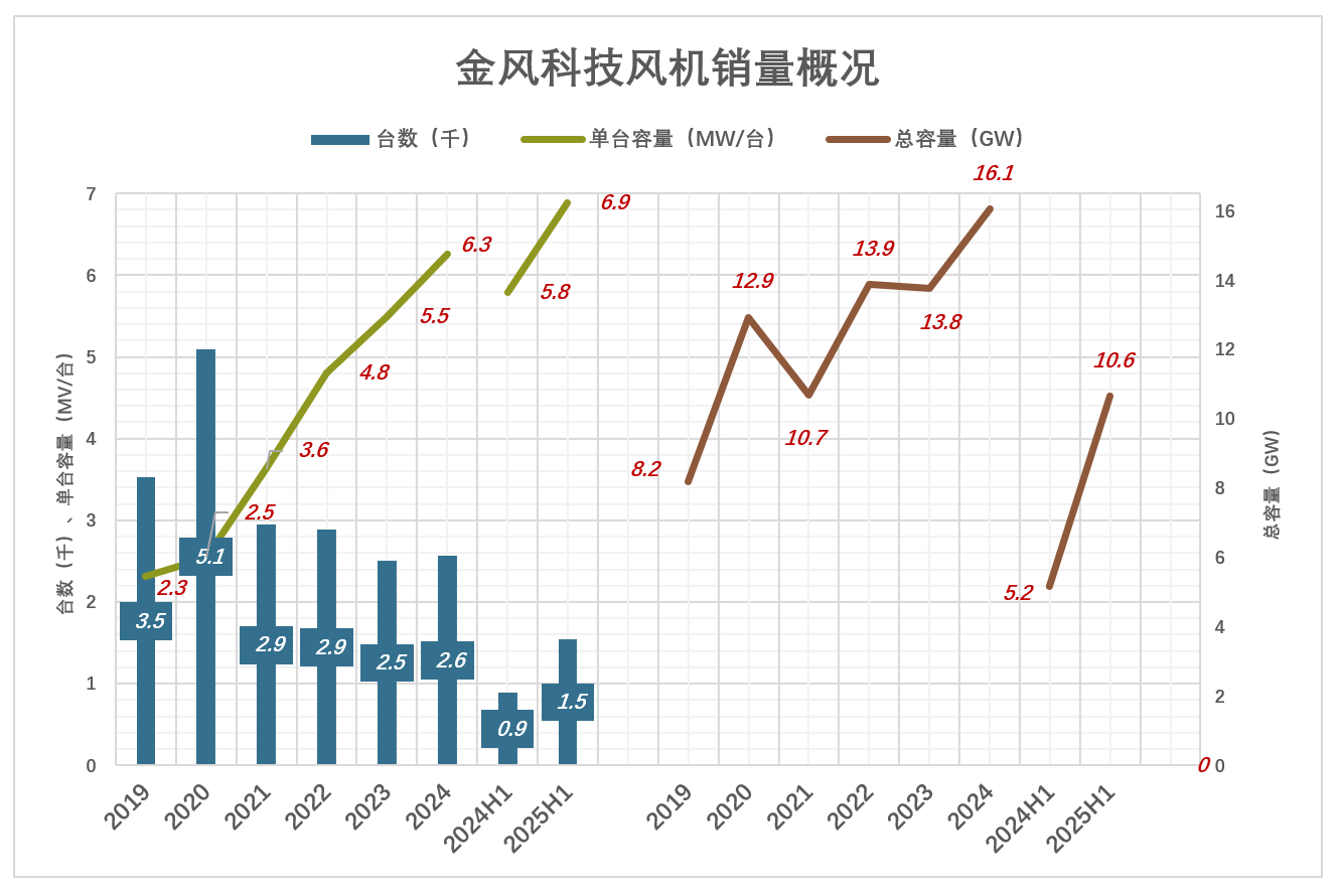 2018年末,金风科技国内外服务业务在运项目为7GW,2021年末达23GW,2024年末增到40GW,2025年6月末达46GW。